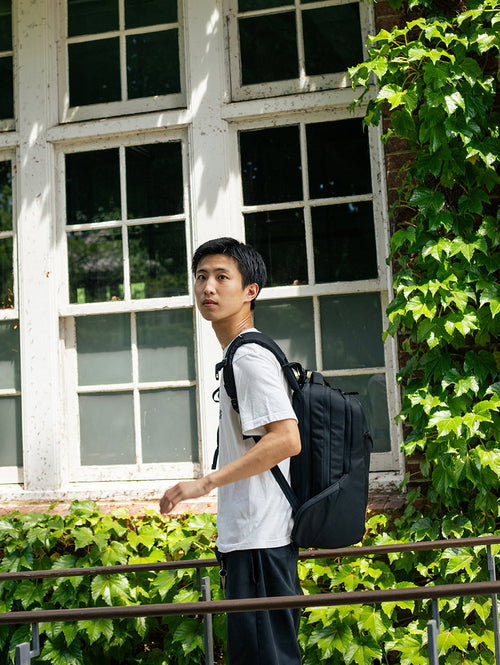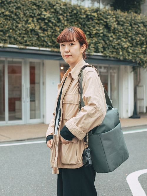 アパレルブランドや企業にグラフィックデザインを提供しながら、杉野服飾大学で非常勤講師も行なう デザイナー/フォトグラフアーの江野 晋平氏。「普段は13インチのMacBookAirとiPad Pro11を両方持ち歩いてます。iPadは、現場でラフを描いたり、メモ取ったり、使用の確認をしてもらたりで、結構使います。今までのバッグで2台持ちって、めっちゃ重いな、、思っていたんですけど、このバッグに変えてからは重さのストレスはかなりなくなりましたね。肩周りのパッドとかですかね?(笑)。それに、メインコンパートメントに、PCスリーブとタブレット用スリーブが両方ともあるので、使いやすさもあります。」デスクでのグラフィックデザインのみならず、撮影やデザインのディレクションを行なうのに地方に出張などもある江野氏は、「PC、タブレット、ガジェットなどの仕事に必須なアイテム以外に、1泊くらいの出張であれば、着替えとお泊まりセットも入れていても一つのバッグでまとめられることができるのですごいですよね。それでもまだ少し容量に余裕がありそうなので、紙の資料なども入れていけそうですね。まだ、紙の資料を受け取ったりすることがあるので(苦笑)。」「普段から、職業柄もあってカジュアルなスタイルが多いんですが、Incaseは今回みたいな異素材の組み合わせでデザインされたバッグは特に、合わせやすいとも思いましたね。」