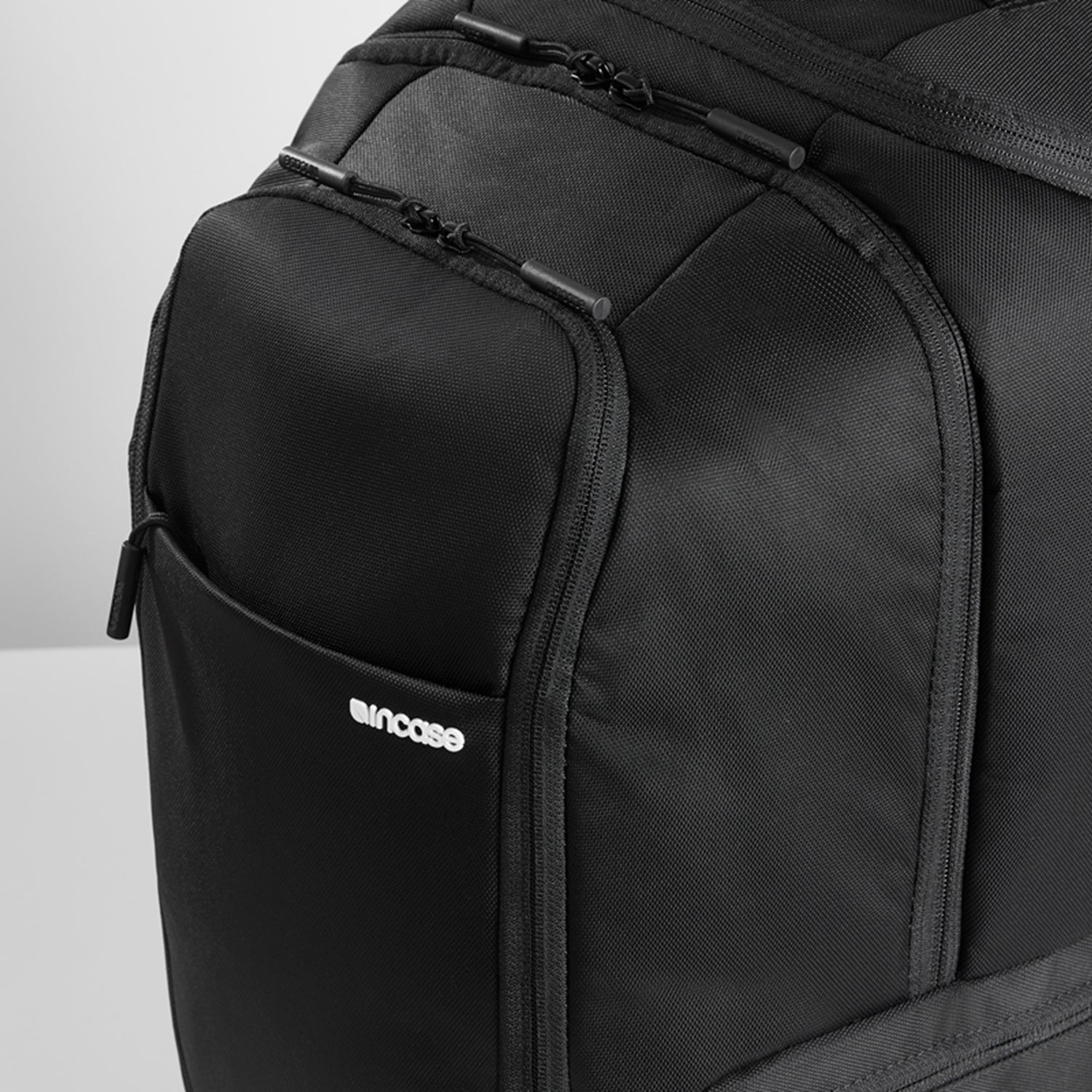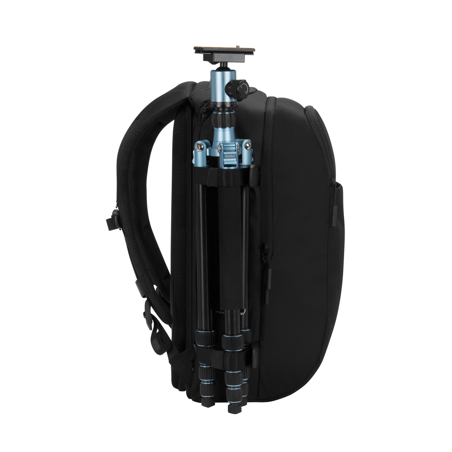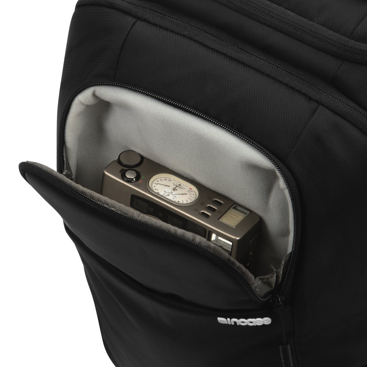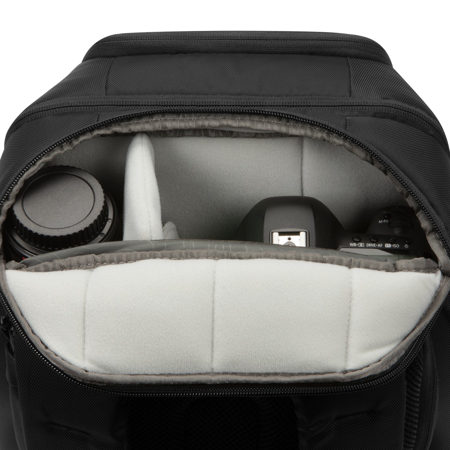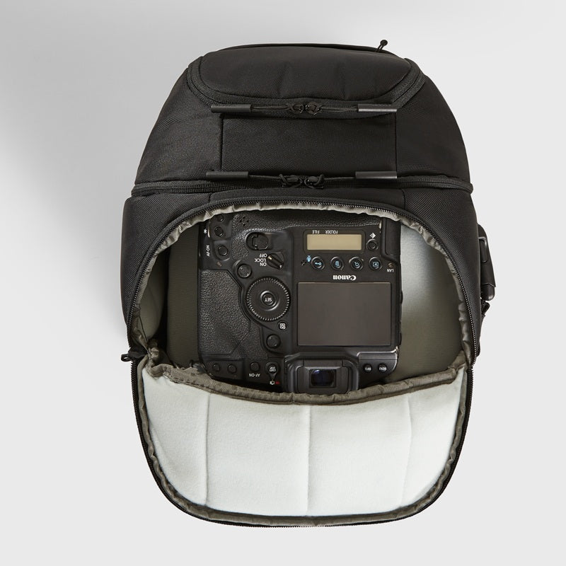 レンズを装着したままの一眼レフと、最大4個までの付け替え用レンズとマルチフラッシュストロボライトを収納できるスペースを搭載。大容量のメイン収納内の仕切りは、自由に調節可能で、仕切りを取り外してしまえば毎日使える通常のバックパックに。開口部裏側にはアクセサリー収納に便利な、2つのメッシュファスナーポケットと、ベルクロで開閉可能なポケットを内蔵。