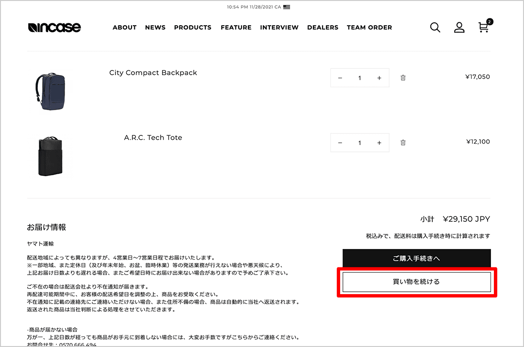 ショッピングを続けたい場合は、「ショッピングを続ける」ボタンをクリックしてください。