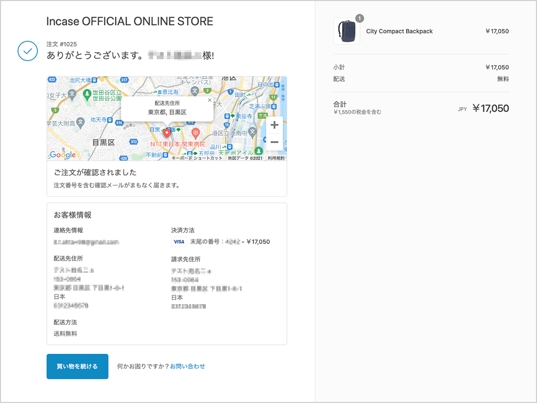 「ご注文ありがとうございます」ページが表示されて、注文手続き完了となります。