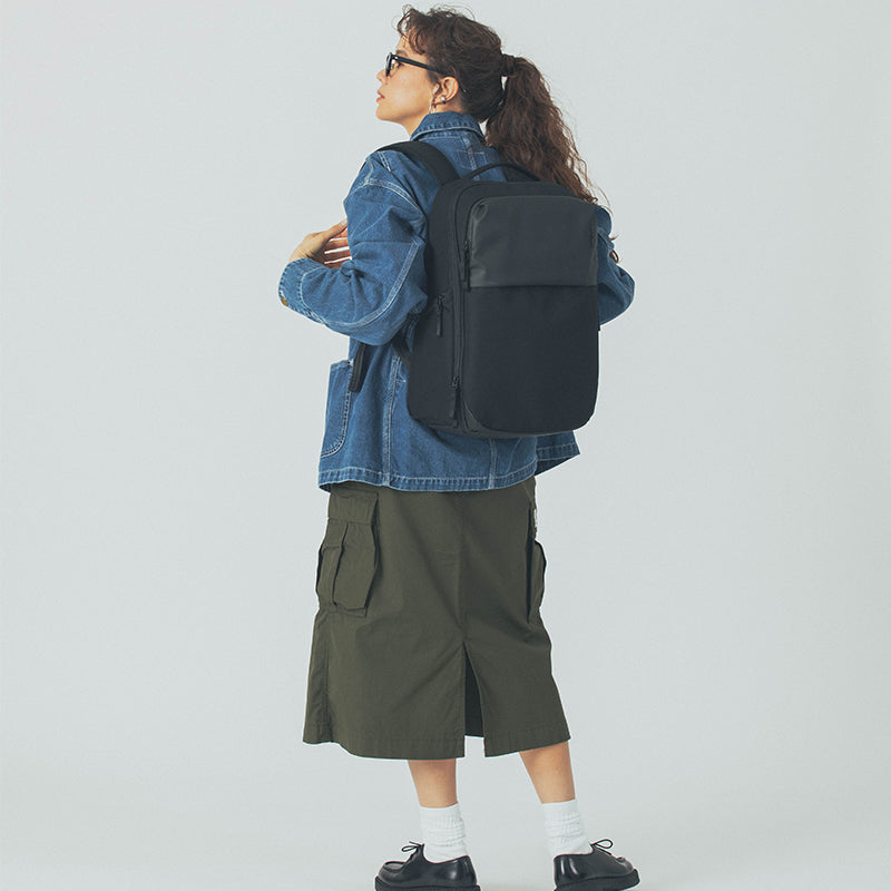 メインファブリックには、水や汚れに強い撥水加工を施したリサイクルポリエステルを使用し、多様なギミックを搭載。ビジネスシーンは勿論、より都会的でタウンユースに特化した無駄のないデザインが特徴です。汎用性の高いサイズ感と、高性能を搭載し、様々なシーンで活躍するユーティリティなバックパックです。